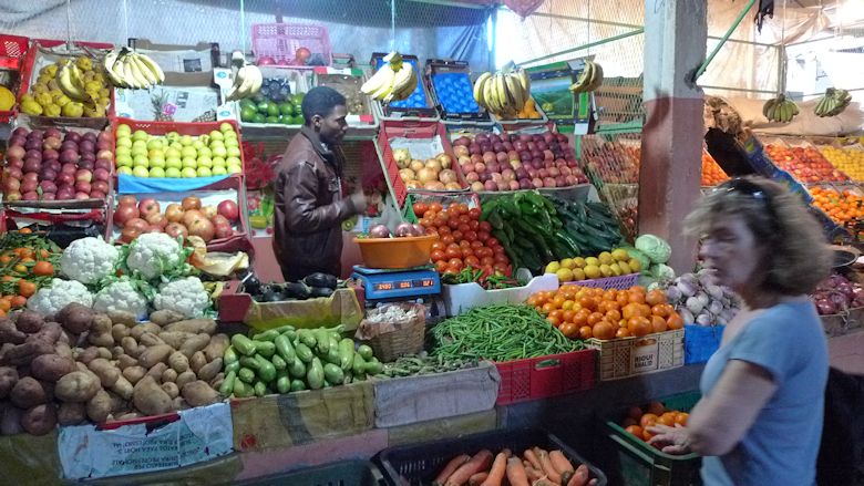 Dort versorgen wir uns noch mit frischem Gemüse. Der Plastikbehälter auf der Waage ist mit Paprika,