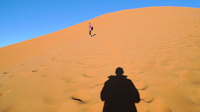 Normalerweise reitet man mit dem Kamel bis unter die Düne.