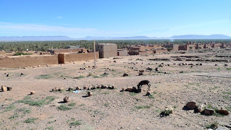 In der Bildmitte im Hintergrund: Das ist unser Camp vom Rand von Mhamid aus gesehen.