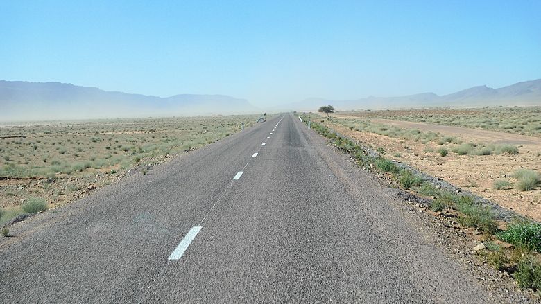 03.01.2015Wir haben die 240 km lange einsame Wüstenstrecke nach Tata begonnen. Vorne wirbelt der Wind mächtig Sand auf.