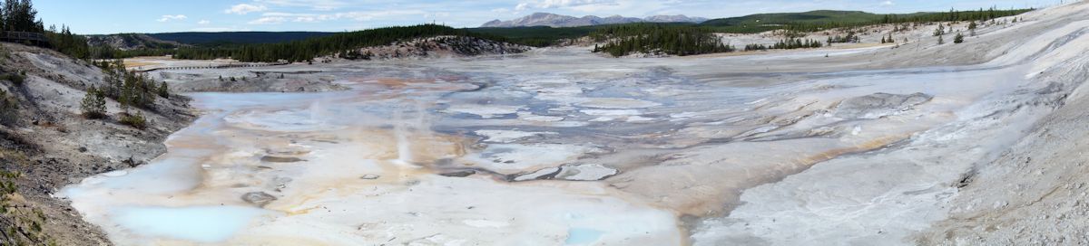 Wir fuhren zuerst die Nordroute (die absoluten Höhepunkte, die großen Geysire, liegen auf der Südroute) bis zum Norris Basin und zum danebenliegenden Porcelain Basin. Das waren schon sehr spektakuläre Naturphänomene: heiße Quellen, Geysire, Schlammtöpfe und Fumarolen. Überall sprudelte es, schoß Dampf aus Spalten, stiegen Wasserfontänen in die Luft. Über allem lag Schwefelgeruch. Auf unserem mehrere km langen Rundweg kamen wir an unzähligen kleinen Geysiren (im Park selbt sind es über 10.000) und Pools vorbei. Einer schöner türkis gefärbt als der andere. Diese Geysire haben alle unterschiedliche Intervalle, wenn sie "ausbrechen". Manche machen jahrelang Pause, manche brechen minütlich aus. Der Steamboat Geysir hier sei der höchste der Welt (91 m), der letzte große Ausbruch war aber am 3.9.2014.