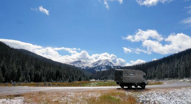 18.09.2015Waren die vorhergehenden Tage vom Fahrerlebnis eher fade, so war die Fahrt durch den Cache la Poudre River Canyon hinauf in die Rocky Mountains erste Sahne. Zuerst der Canyon, dann die bereits im Herbstlaub stehenden Wälder und dann die Schneegipfel. Die Straße erreichte beim Cameron Pass 3.132 m Höhe und in der vorhergehenden Nacht hatte es bereits geschneit.
