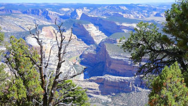 Das Dinosaur NM erschließt sich nur durch ein paar Stichstraßen die hineinführen. Wir sind die Harpers Corner Road bis zum Ende gefahren (50 km einfach) und haben an deren Ende den Trail in 2.400 m Höhe entlang der Abbruchkante gemacht (1,5 km einfach). Die River fließen immerhin 1.000 m weiter unten (am Grand Canyon 1.400 m) im Canyon.