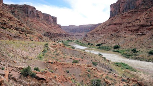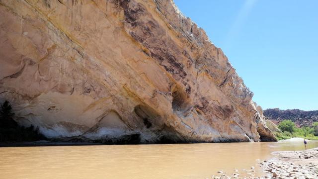 Nach dem Douglas Pass (2.520 m)gings hinunter zur Interstate 70 und dort wieder nach Utah. Bald zweigte der Highway 128 Richtung Moab ab und der war nun wiederum ein Highlight. Er führt durch den Colorado Canyon bis Moab. Der selbe Colorado, der ein paar hundert Meilen südwestlicher den Grand Canyon herausgeschliffen hat, ist hier noch ziemlich zahm. Er bekommt ja auch südwestlich von Moab Verstärkung durch den Green River, den wir heute morgen am Dinosaur NM verlassen haben.
