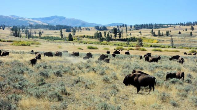 09.09.2015Der Yellowstone Park ist in seiner Schönheit mit Worten nicht zu fassen (und auch nicht in den Bildern). Das Traumwetter tat sein übriges dazu. Schon kurz nach der Abfahrt vom Campground eine Herde Bisons.