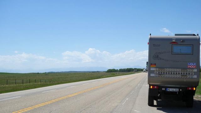 09.06.2015 So etwa 100 km vor Banff (30 nach Calgary) sehen wie zum ersten mal die Rockies in der Ferne