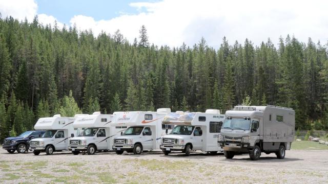 14.06.2015 Parkplatz am Maligne Canyon mit 4 Mietmobilen und einem importierten RV