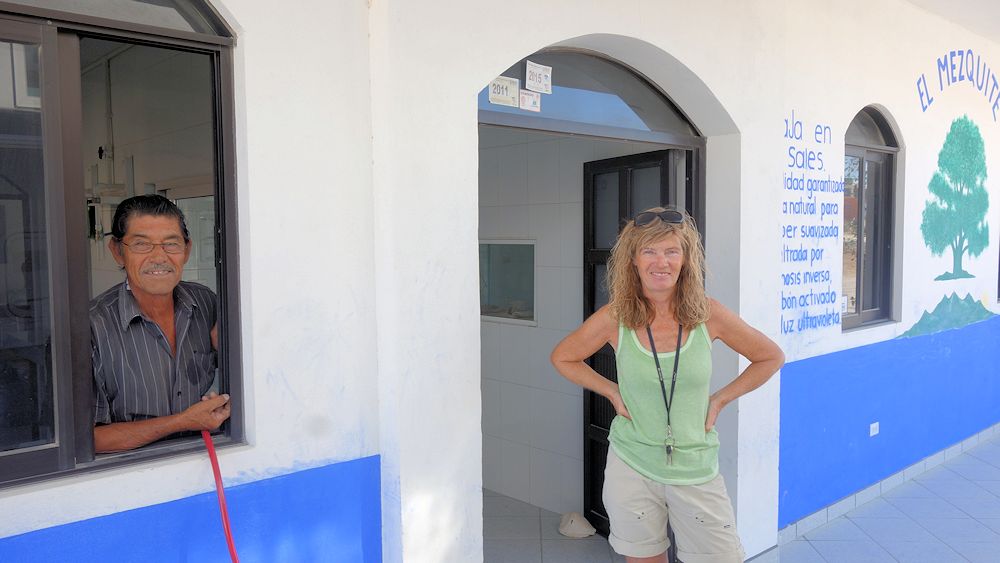 das er fast leer war.Nun gibt es außer dem salzigen Wasser aus der "Wasserversorgung" noch Trinkwasser in Gefäßen bis zu 20 l zu kaufen oder man bedient sich aus einem der zwei öffentlichen Trinkwassertanks, die aber für die einheimische Bevölkerung gedacht sind. Dazu gibt es, wie überall in Mexiko, auch Verkaufsstellen für Trinkwasser, "Purificadora" genannt. Hier wird angeblich besonders gut aufbereitetes Trinkwasser verkauft (Umkehrosmose, Aktivkohlefilter, UV-Entkeimung). Da wir schlecht fünfzehn 20 Liter Behälter in unseren Tank kippen können, war das für uns keine Alternative bisher. Aber wir haben nachgefragt und heute hatte Ramon Dienst in der Purificadora und der zauberte uns einen Schlauchanschluß zum Wohnmobil. So waren relativ schnell 300 Liter im Tank und das reicht uns mal 14 Tage lang, wenn wir sparsam umgehen. Das ganze kostete gerade mal 150 Pesos (7 €).