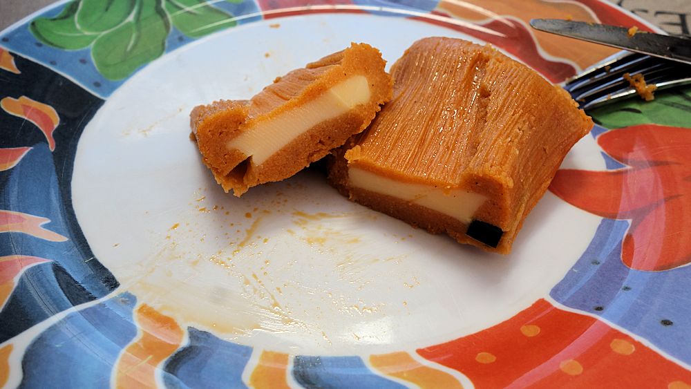 Tamales werden in einem Maisblatt zubereitet, das vor dem Verzehr entfernt wird Innen befindetb sich ein Maisbrei, der verschieden gefüllt wird. In anderen Gegenden von Mexiko wird auch ein Bananenblatt als Hülle verwendet. Auf dem Foto sieht man noch die Struktur, die durch das Maisblatt geformt wird.