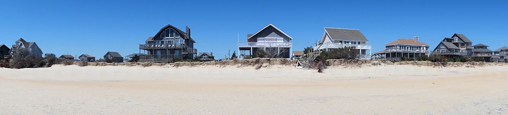 Wie auch gestern fuhren wir durch endlose Ferienhaus-Siedlungen, die alle leer standen. Die Saison beginnt so ab Memorial Day (3. Mo im Mai) und endet an Labor Day (1. Mo im Oktober). Alles sehr vornehm und gepflegt. Die Häuser stehen alle auf Pfählen da die Outer Banks nur wenig über dem Meeresspiegel sind und bei Hurrikanen leicht überschwemmt werden.