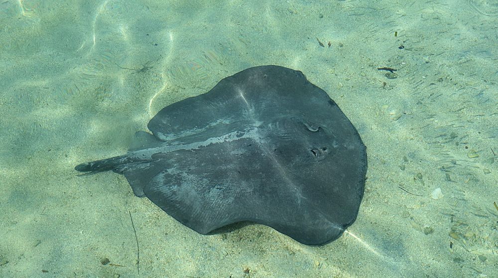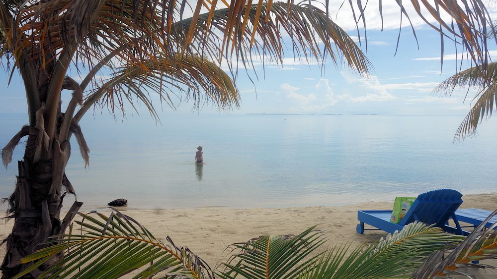 10.11.2016, Placencia (Mariposa Hotel), Stann Creek, BelizeHeute morgen war das Meer spiegelglatt, so dass man das Leben dort vom Ufer aus sehen konnte. Sogar Stachelrochen schwammen im seichten Wasser.