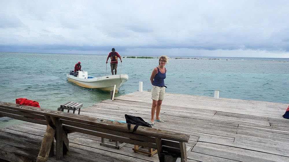 14.11.2016, Tobacco Caye, Stann Creek, BelizeAm Morgen hat uns Eileen, Brandons Frau, zum Anleger gefahren, wo wir, zusammen mit einem belgischen Pärchen, das Schnellboot bestiegen.