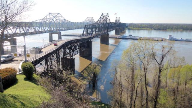 Blick auf den Mississippi vom Ostufer aus. Der Schubverband ist deutlich breiter als zum Beispiel auf dem Rhein.