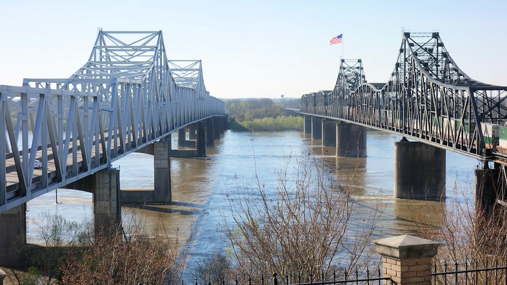 Die Brücke links ist für die Interstate 20, die ältere Brücke rechts für die EWisenbahn und früher auch für Autos.