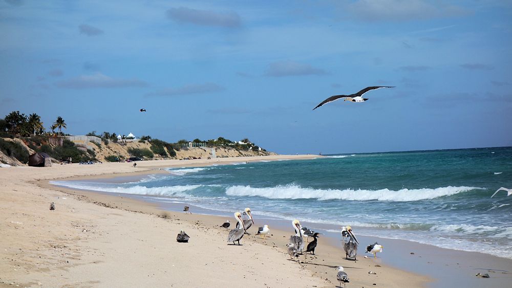 Irgendwas lag da wohl am Strand, das die Seevögel so angelockt hat