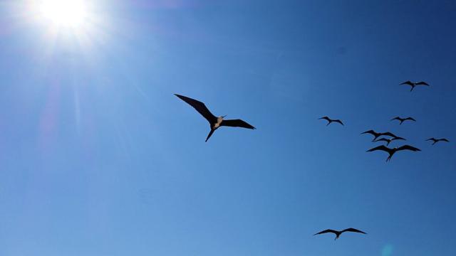 Die Fregattvögel segeln ohne Flügelschlag am Himmel und warten ebenfalls auf Fischabfälle.