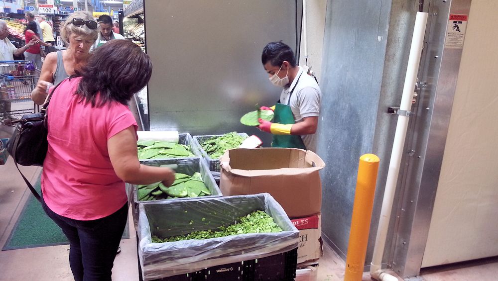 Kakteen kann man auch essen. Der junge Mann entfernt die Stacheln und schon kann man sie roh als Salat verzehren. (Im Walmart)