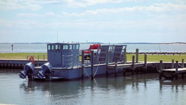 Hinter der kleinen Fähre sieht man den Leuchturm auf den Core Banks: Cape Lookout Lighthouse