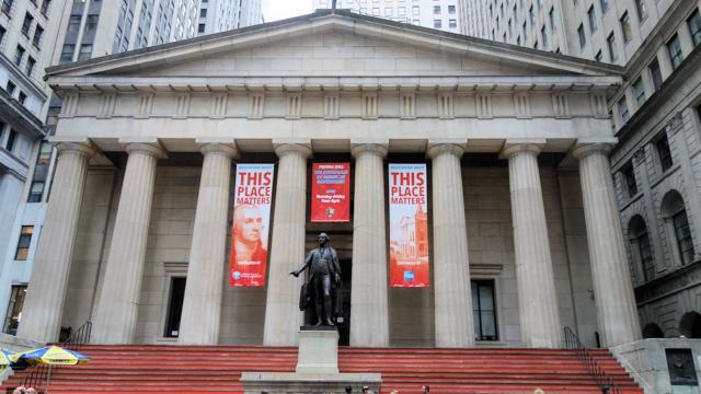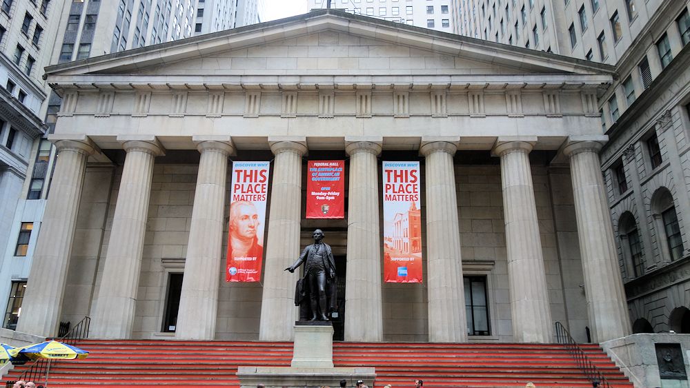 Vor der Federation Hall steht George Washington. Er wurde hier vereidigt (1789 - ein Jahr später wurde Washington Hauptstadt)
