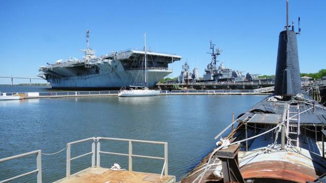 Flugzeugträger Yorktown, Zerstörer Laffey und das U-Boot Clamagore bilden das Marine Museum