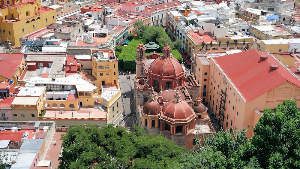 In der Mitte die Kirche San Diego, rechts daneben das Teatro Juarez und das grüne Dreieck "über" der Kirche ist der Jardin de la Union, die "gute Stube" von Guanajuato.