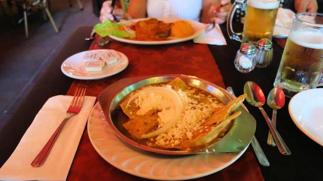 Unser Mittagessen im Hotel Possada de Santa Fé am Jardin de la Union: Chiles Rellenos (gefüllte Paprika) und Enchiladas Verdes (Tortillas mit grünen Pepperonis), jeweils mit Käse anstatt Huhn.