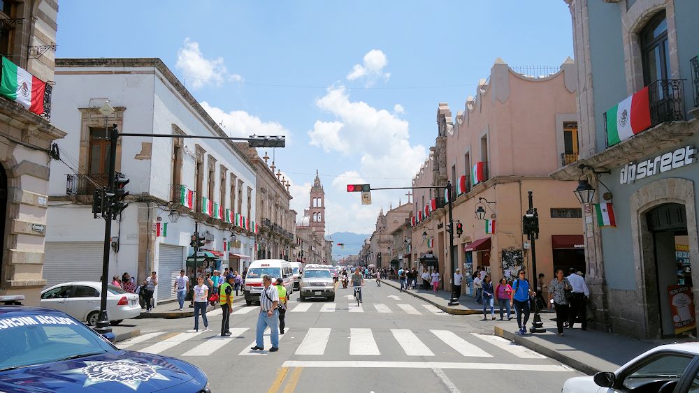 Avenida Madero Ote, die Straße mit den schönsten Palästen in Morelia. Wegen der Demonstration war sie hier gesperrt, gut zum fotografieren.