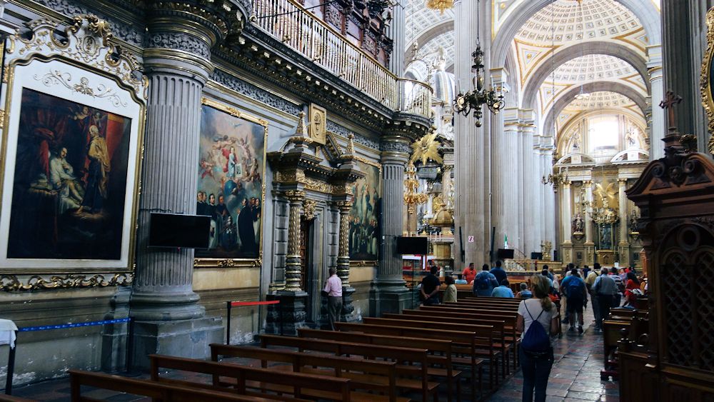 Die Kathedrale von innen. Sie hat 5 Schiffe und das Hauptschiff wird durch die Orgel und einen freistehenden Hauptaltar in Form eines überwölbten Rundtempels unterbrochen.