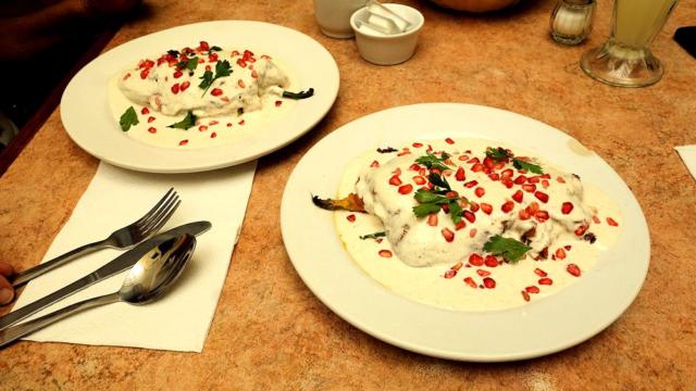 ..mit der hiesigen Spezialität "Chiles en nogada". Süß-scharf gefüllte Chilischote mit Walnusssoße und Granatapfelkernen.