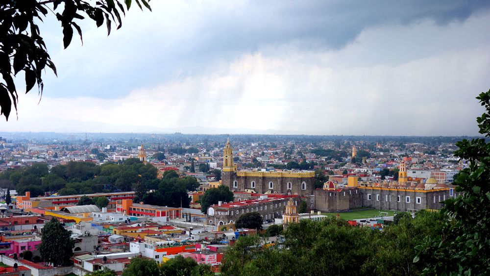 Blick auf Cholula (mit dem abendlichen Gewitter am Himmel).