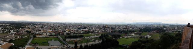Blick nach Osten,wo man am Horizonzt die Hochhäuser von Puebla erkennt.