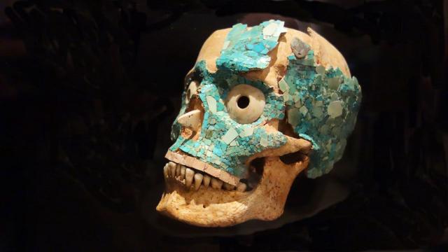 Exponate aus dem "Grab 7": Der berühmte Totenkopf mit Türkismosaik (ein rituelles Gefäß).