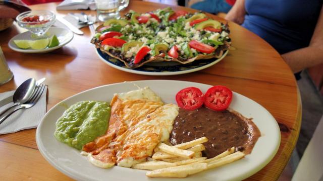 Zum Lunch gab es heute gegrillten Oaxaca-Käse mit Guacamole, Bohnenmus, Kartoffeln und Tomaten (unten) und eine Art mexikanische Pizza: Riesen-Taco belegt mit Bohnenmus, Salat, Avocados und Tomaten, darüber Käsestreusel.