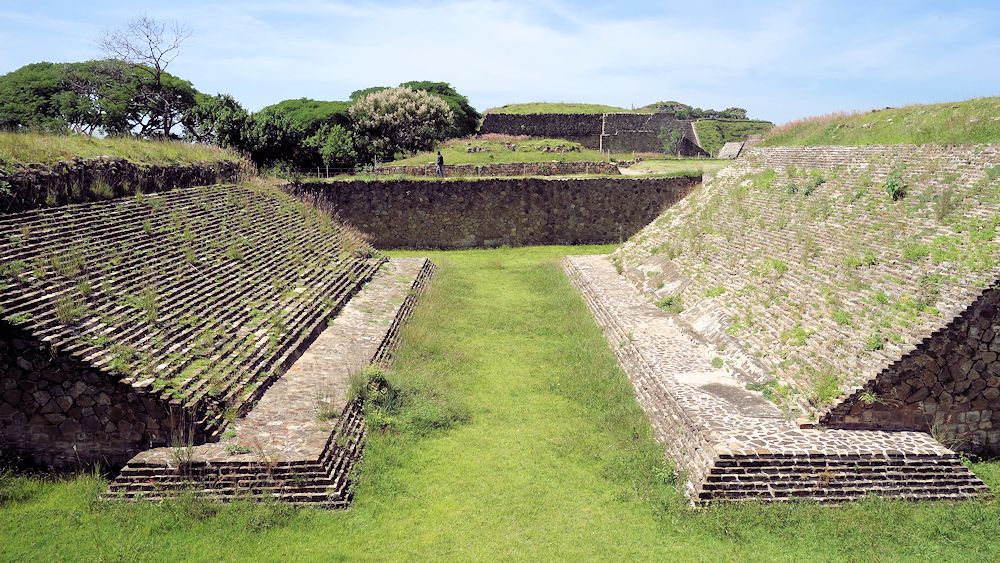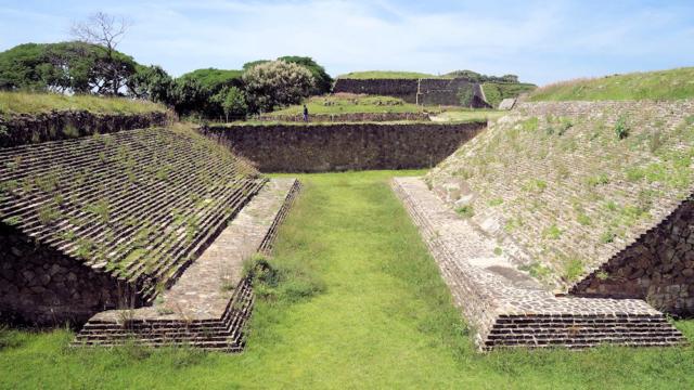 Ballspielplatz; Die frühen Ballspielplätze (wie hier) hatten schräge Begrenzungen, spätere senkrechte Mauern.