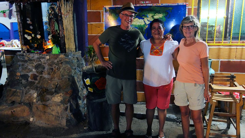 Bei der Wirtin, Juana, pinnen wir in die Weltkarte unser Herkunftsland. Wir sind die erste deutsche Nadel.