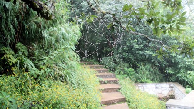 Ein riesiges Spinnennetz am Aussichtspunkt. Gottseidank war die Hausherrin nicht da. Seit gestern im Zoo wissen wir, wie groß die Radnetzspinnen hier werden können.