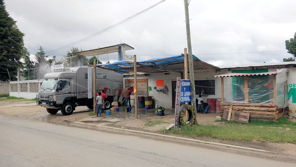 Das Problem mit dem zu kurzen Wasserschlauch haben wir durch Umdrehen des Fahrzeugs gelöst.