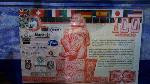 Auch gegen die Biopiraterie des Westens wird gewettert. Gemeint ist, das Agrarkonzerne sich Saatgut patentieren lassen, das (auch) aus der Heimat der Mayas kommt. Der Aufstand der Zapatisten am 1.1.1994 war nicht zufälligerweise der Tag des Inkrafttretens des NAFTA Abkommens (Handelsabkommen zwischen Kanada, USA und Mexiko ähnlich TTIP) |