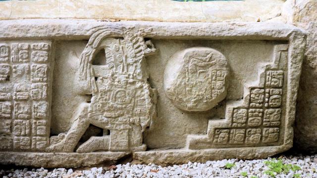 Grausames Relief: Menschliche Bälle, Gefangene werden als Bündel verschnürt die Treppen hinuntergerollt. König Vogel-Jaguar schaut zu.