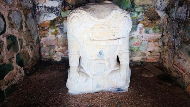 Nach den Vorstellungen der noch heute in diesem Gebiet wohnenenden Lacandonen (Maya-Stamm) darf diesem Torso des Königs Vogel-Jaguar ...