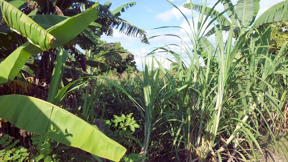 Rings um die Lagos werden alle möglichen tropischen Nutzpflanzen angebaut: hier Bananan und Zuckerrohr.