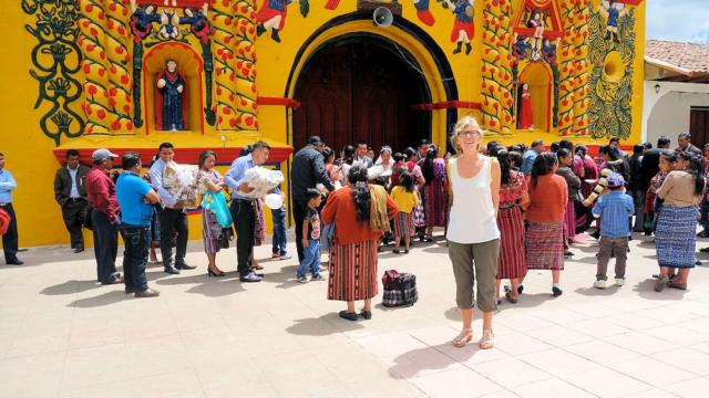 Vor der Kirche nun eine Hochzeitsgesellschaft. Das Brautpaar vor dem Tor. Die Gäste (von links) haben Geschenke in der Hand, die sie dem Brautpaar überreichen.