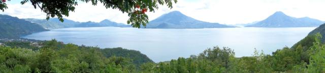 Ein paar hundert Höhenmeter über der Seehöhe kommen dann alle drei Vulkane zum Vorschein: rechts der "San Pedro", in der Mitte der "Tolimán und dahinter, kaum zu erkennen derwesentlich höhere "Atitlán". Links unten liegt Panajachel, der Hauptort am See. |