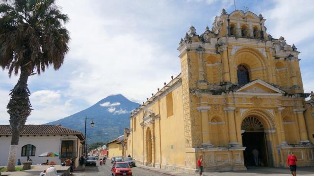 Iglesia San Pedro mit Vulkan Agua im Hintergrund
