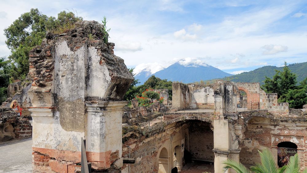 Im Hintergrund in den Wolken die Vulkane Acatenango und Fuego