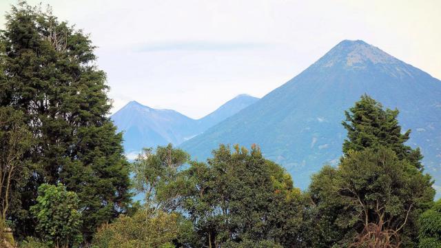 Dank der frühen Morgenstunde (es ist jetzt kurz nach 8 Uhr) können wir die Vulkane klar sehen: (v.links) Fuego, Acatenango und Agua.