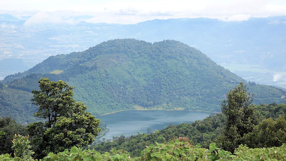 Blick auf einen alten Krater mit See. Im Hintergrund ist ganz schwach Guatemala-City zu erkennen.