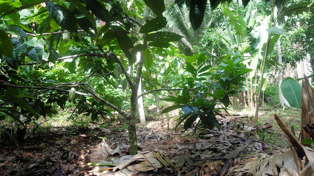 Wir haben geglaubt, eine Kakaoplantage wäre sowas wo die Pflanzen in Reih und Glied stehen. Aber hier, mitten in der Plantage, erkennt man das gar nicht. Die niedrig gehaltenen Bäume stehen im Unterholz (Schatten), kaum zu erkennen.