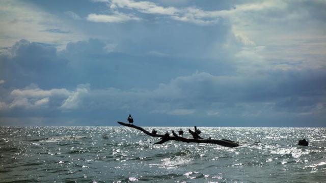 Auf dem Treibholz bewachen die Pelikane die Mündung.