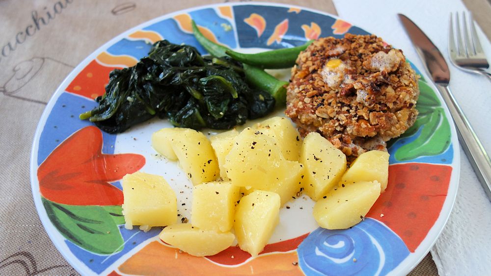 Linsen-Burger, Okraschoten (auch selbstgepflückt), Spinat und Salzkartoffel.